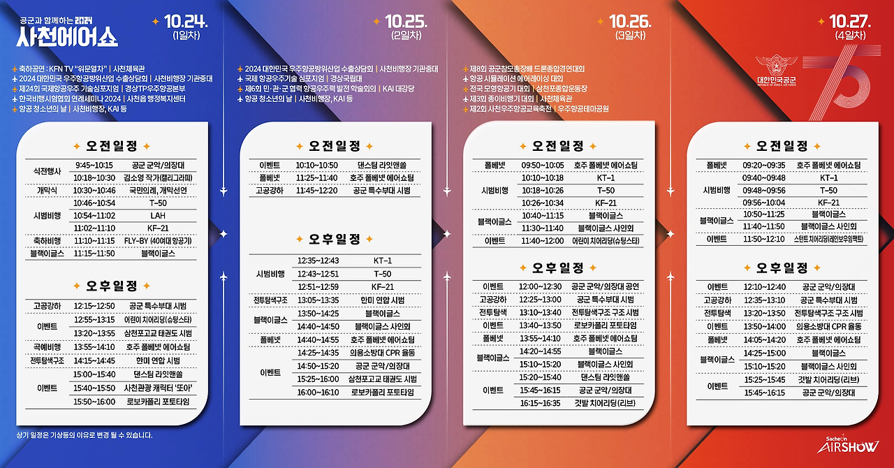 2024년 사천 에어쇼는 단순한 비행기 시연을 넘어서, 가족과 친구와 함께 특별한 추억을 만들 수 있는 좋은 기회입니다. 다양한 프로그램과 볼거리가 마련되어 있으니, 일정을 참고하여 사전 준비를 하시기 바랍니다. 사천에서의 멋진 경험을 놓치지 마세요!